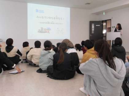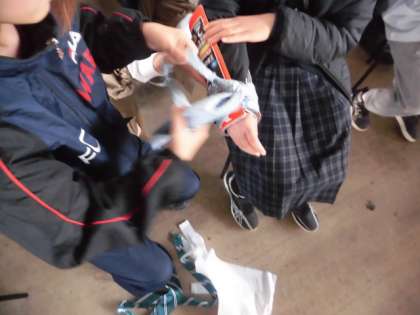 怪我をした時に雑誌やビニール袋を使って応急手当をする仕方やクイズ等、子どもたちは楽しみつつ、真剣に体験していました。