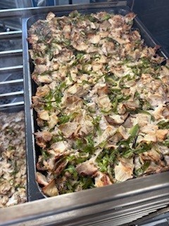 「豚肉のオイスターソース焼き」は、豚肉にしょうが汁、にんにく、オイスターソース、こいくちしょうゆ、綿実油で下味をつけ、ピーマンを混ぜ合わせ、焼き物機で焼きます。