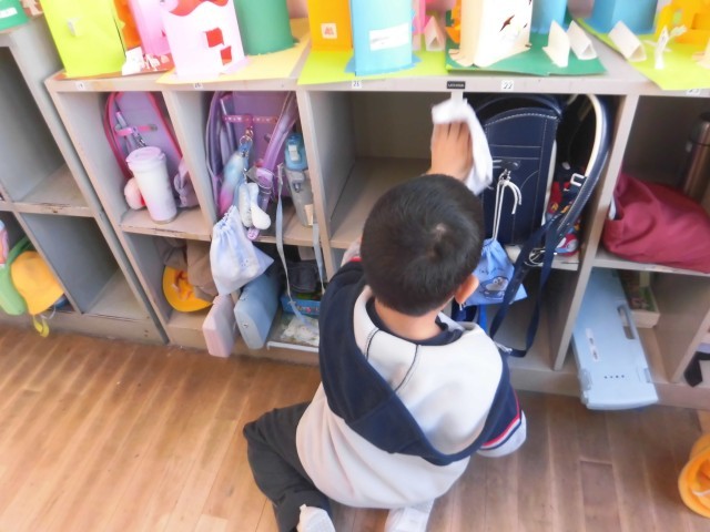 今日は、2年生が3時間目に大掃除をしました。明日から冬休みに入るので、教室のロッカーの中を雑巾できれいに拭いたり、ガムテープを使って机や椅子の脚の汚れを取ったりしてみんなで協力してできました。