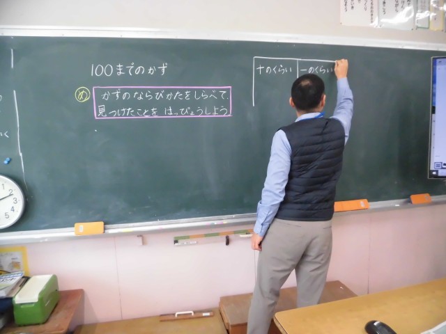 1年生は3時間目に算数の学習をしました。100までの数で、数の並び方を調べて見つけたことを発表しました。