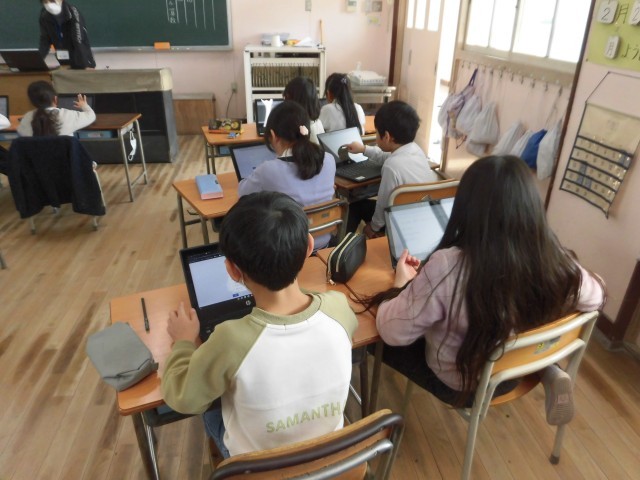 2年生は、5時間目にタブレットを使って学習しました。体育の時間に跳び箱の動画を撮り、その動画を見て「跳び箱の振り返りシート」を入力しました。