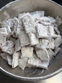 「くじらのたつたあげ」は、冷凍のまま170℃のなたね油であげます。