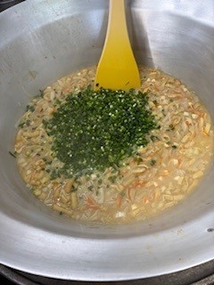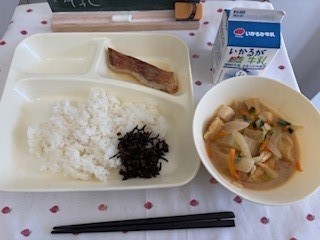 「みそ汁」は、とうふ、うすあげ、だいこん、たまねぎ、はくさい、にんじん、青みに青ネギを使用したみそ汁です。