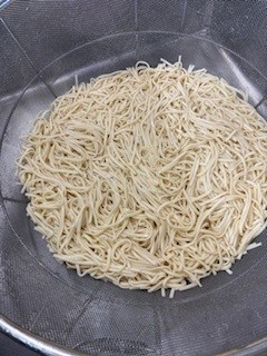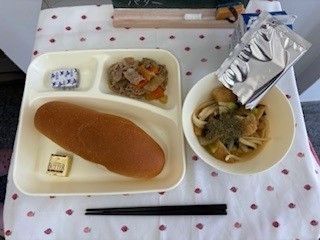 「なにわうどん」は、1/16の三角に切ったうすあげを焼き物機で煮ます。かまぼこ、はくさいと青みに青ネギを加え、だしの旨みを味わうことのできるシンプルなうどんに仕上げています。教室で配食後、とろろこんぶを1人1袋入れていただきます。