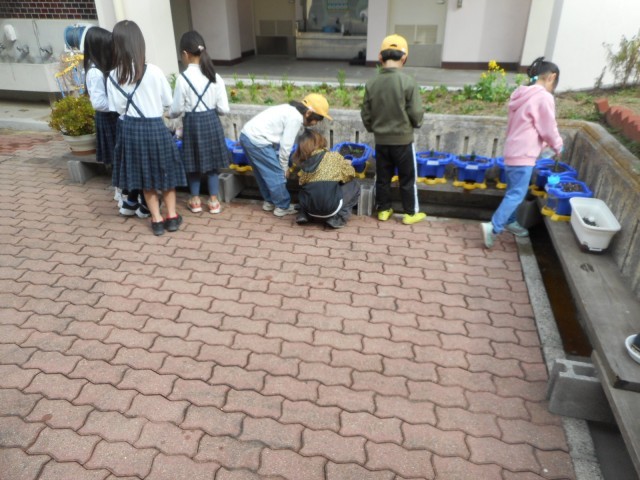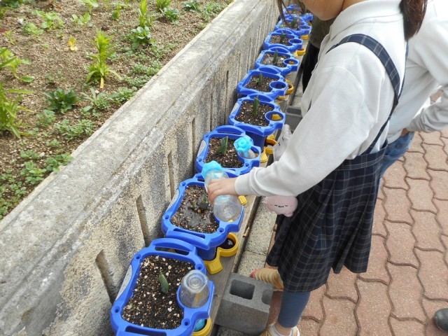 1年生の生活科では、育てているチューリップの観察をしました。チューリップの芽は順調に育っているようです。
