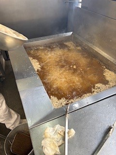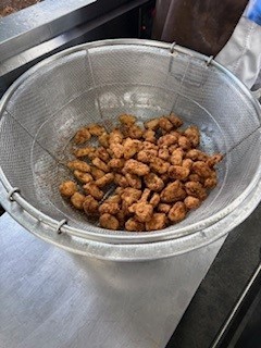 「よもぎだんご」は、焼き物機で蒸したよもぎだんごにみつをからませ、喫食時にきな粉をかけて食べます。春を感じる献立の一つです。