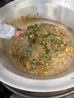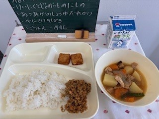 今日の給食は、「鶏肉とじゃがいもの煮もの」鶏肉、じゃがいも、たまねぎ、にんじん、しいたけ、青みにさんどまめを使用した和風の煮物です。
