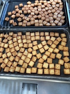 「あつあげのしょうゆだれかけ」焼き物機で焼いたあつあげに砂糖、みりん、こいくちしょうゆで作ったタレを配缶時にかけます。
