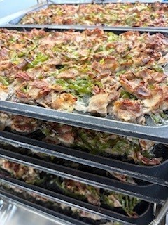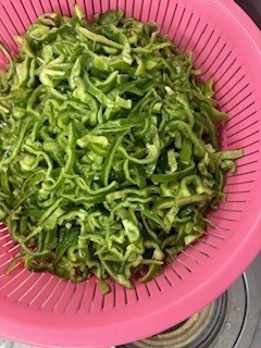 「豚肉のガーリック焼き」は、豚肉にワイン、塩、こしょう(粗挽)、ガーリック、こいくちしょうゆ、綿実油で下味をつけ、ピーマンを加えて混ぜ合わせ、焼き物機で焼きます。