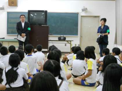 住之江警察から警察官の方々をお招きして、4年生を対象に警察署の仕事についてお話を伺いました。警察の組織や交番の活動、警官の服装や持ち物などについて、詳しく教えてくださいました。子どもたちから「どうして警官になろうと思われたのですか」「パトカーはどれぐらいの数がありますか」などの質問が出され、一つ一つていねいに答えてくださいました。