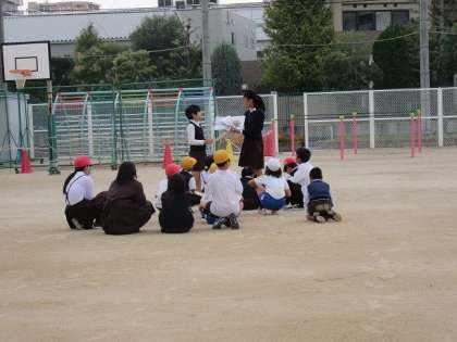 読み聞かせの会は、運動場で行っています。