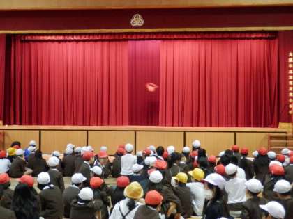 今日の児童集会は、体育館で「当てっこゲーム」を楽しみました。舞台の上のカーテンとカーテンの間を飛んでいくものを、たてわり班の仲間と相談して当てるゲームでした。一瞬しか見えないランドセルや黒板消しなどを、班のみんなで相談して言い当て楽しみました。最後はサプライズもあって、たいへん盛り上がりました。