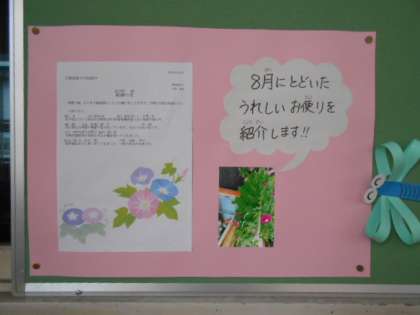 その方が、アサガオの種をくれた皆さんの先輩がいることを皆さんにも知ってほしいと、言うことで、お手紙と、アサガオの写真を届けてくれました。