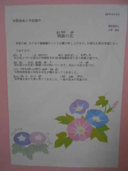 時には、「美しい朝顔ですね。」とほめていただいた方に、そのアサガオの種をお譲りになり、加賀屋小学校の朝顔が、地域にひろがっていったそうです。
