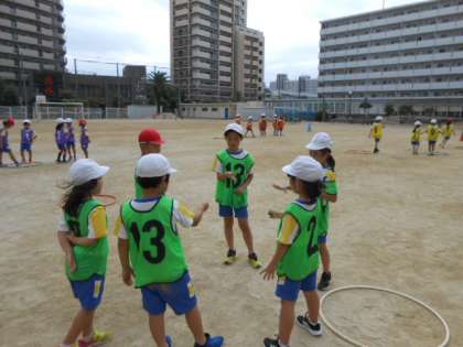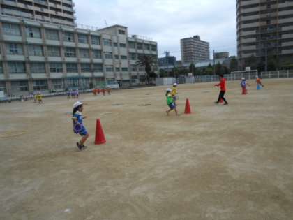 小型ハードルや、フラフープなどの障がい物をリズムよく超えながらリレー遊びを楽しみました。