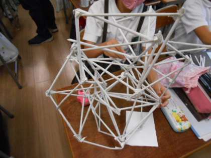紙を丸めて作ったストローのような材料をつなぎ合わせ、ジャングルジムのような立体作品を作りました。