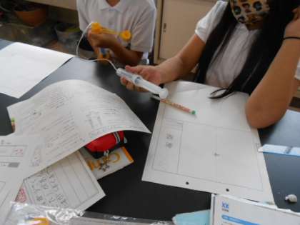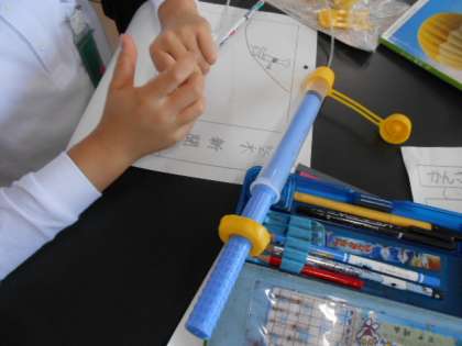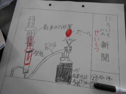 空気と水の性質で、似ているところ、違うところを、空気でっぽうや、注射器を使って学習しました。