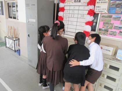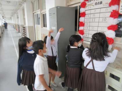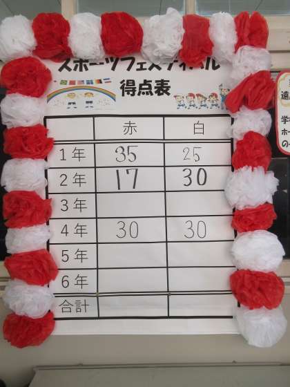 月曜日の2年生、火曜日の4年生・1年生の競技が終わり、得点が発表されました。