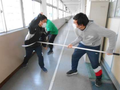 まずは、全体で不審者が校内に侵入してきた場合の、教職員の対応マニュアルの確認をし、「さすまた」や、身近にあり代用できる防犯器具の使用法の注意点を確認しました。