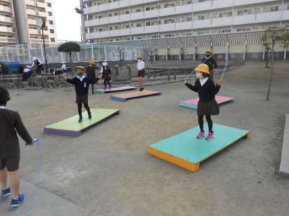 短なわで「二重跳び」「三重とび」などの難しい技をするとき、跳躍の補助として使います。