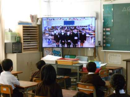 例年は、1,2年生一斉に体育館で行っていましたが、今年は、1組、2組に分かれて、複数の教室を使用しました。また、オープニングセレモニーも録画して1年生の教室で見るようにしました。