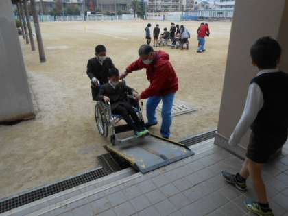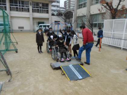 大阪市リハビリテーションセンターの職員の方々にお越しいただき、4年生が車いす体験の出前授業を行いました。