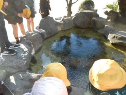 今朝、学校に来てみると、運動場の池の水が凍っていました。登校してきた子どもたちも凍っている池を見て驚いていました。中には、「池の水、凍っていないかな?」と、予想して登校する子どももいました。