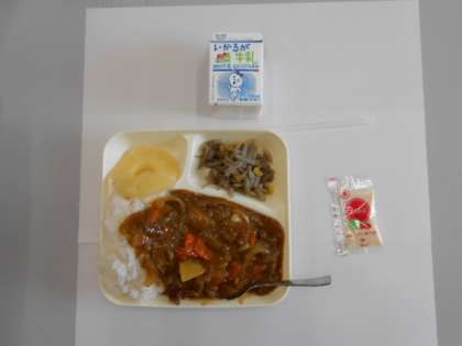 今日の給食は「牛肉と金時豆のカレーライス」です。