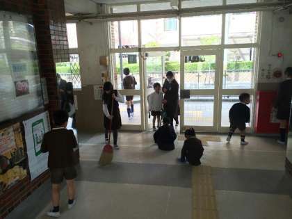 卒業式を来週に控え、たてわり班のみんなで学校をきれいにしました。今年度のたてわり班活動は、今日の活動で最後になります。普段の掃除では見落としがちなところを「ピカピカポイント」として、たてわり班のみんなで重点的に掃除していきました。6年生が1〜5年に優しく教えながら、清掃活動をすすめることができました。