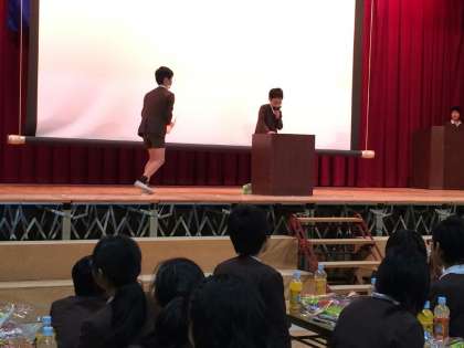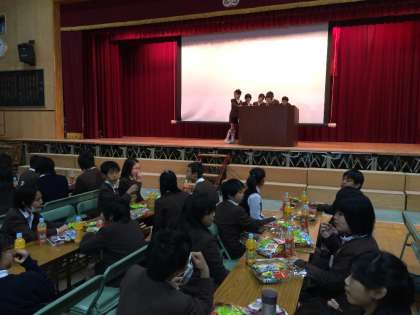 卒業式まであと1週間となった6年生は、講堂に集まり茶話会を行いました。ともに過ごした仲間たちと、お菓子を食べながら楽しいひとときを過ごしました。卒業式の練習の合間をぬって準備してきた出し物を、グループごとに発表して楽しみました。