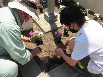 夏に向けて、日日草とペチュニアの苗が届いたので、早速植えることになりました。管理作業員さんに植え方を教えてもらいながら、配置や配色を考え植え付けました。
