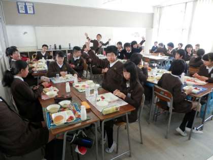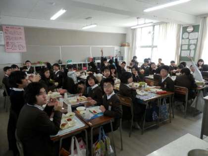 今日の給食は卒業祝い献立でした。献立には、6年生の卒業をお祝いする気持ちが込められています。「ビーフチャップ」「ほたてグラタン」「コーンスープ」「いちご」「パン」「牛乳」のメニューでした。みんなで楽しくいただきました。
