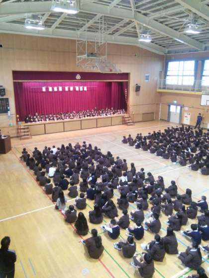 講堂の舞台に1年生が並んで座ると、目の前には、大勢のお兄さんとお姉さんたちの姿が見えます。余計にドキドキしそうです・・・。