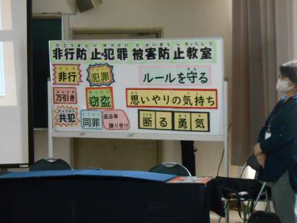 万引きなどの歩行についての法的なお話や、声掛け事案等の犯罪から身の守り方、SNSの正しい利用の仕方、いじめについてのお話等、身近に起こりうる非行や犯罪から自分自身の身を守ったり、友だちを傷つけたりしない、という話をしていただいたりしました。