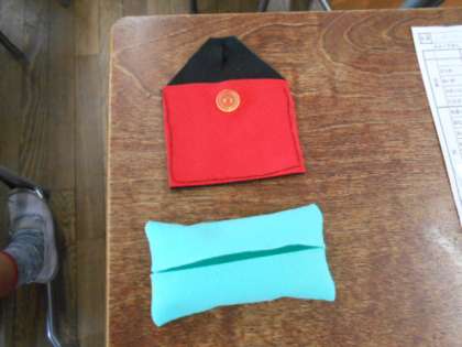 これまでに学習した「玉どめ」「玉結び」や「ボタンのつけ方」「いろいろな縫い方」を活用しながら、思いにあった作品作りをしました。