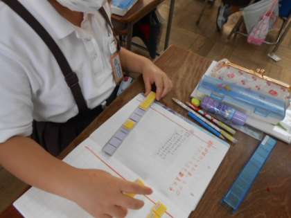 縦に並べたり、横に並べたり、固まりで並べたりといろんな並べ方で、かけ算の考え方を確認しました。