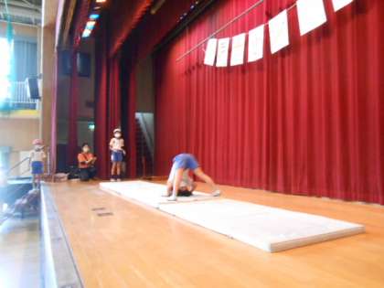 これまで練習してきた「前転」「開脚前転」「後転」「開脚後転」や、独自の技をみんなの前で発表しました。