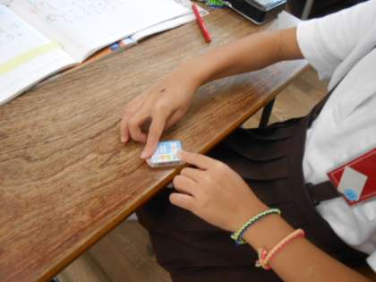 今日は、鉛筆や消しゴム、教科書を使って、「○○の□つ分」という測り方に挑戦しました。