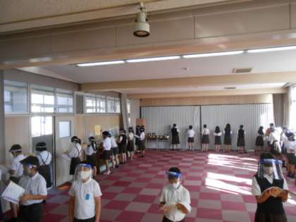 教室より広い第2音楽室で、フェースシールドを付け、対面にならないような形で歌を歌いました。