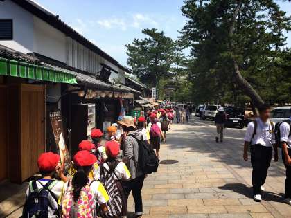 天然記念物のシカを見つけては、写真を撮ったり、かわいいと口々に感想を述べたりしながら、協力して楽しんでいました。