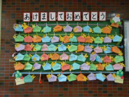 1月の玄関掲示は、3年生が、今年の目標を絵馬に書いてくれたものです。