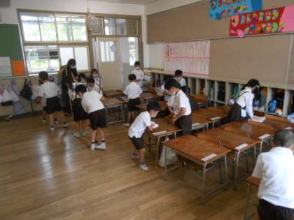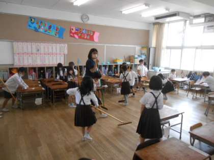 机の移動の仕方や、ほうき、塵取りの使い方の学習でもあります。