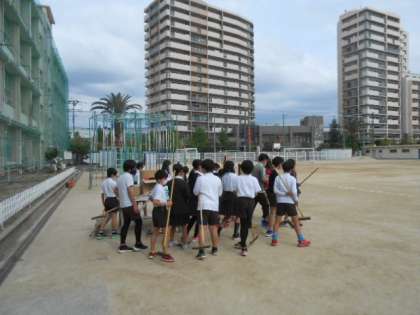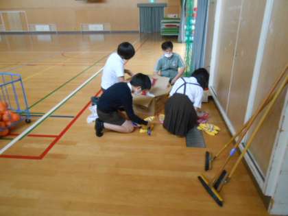 運動委員会は、主に、かけ足週間や、なわとび週間のような体育的行事の時に、みんなの前で説明や準備運動をしたり、体育用具の片づけをしたりします。