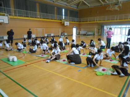 5年生、6年生は、心肺蘇生法訓練と毛布担架体験