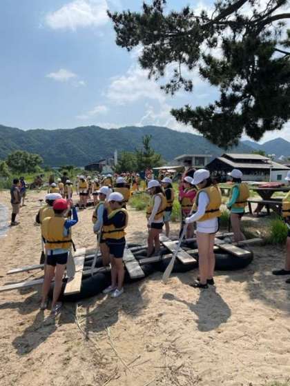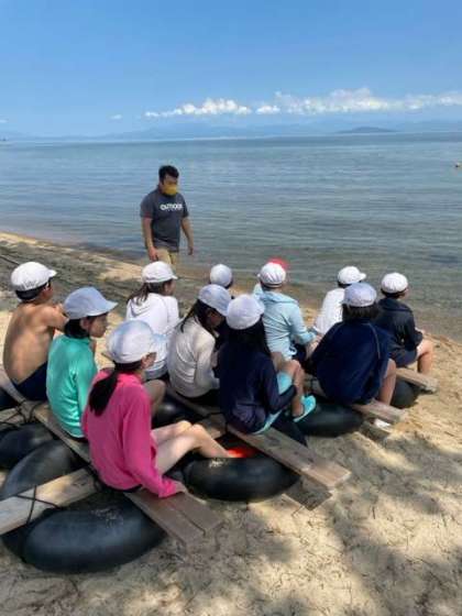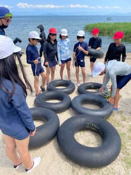 みんなで協力して作ったいかだは、琵琶湖に浮かべて遊びました。