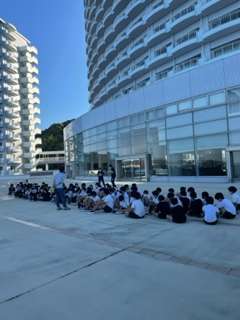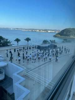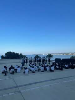 朝のつどいでは、テラスで海を背景に、体操をしました。