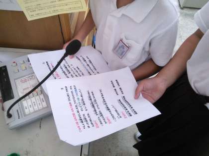 委員長と副委員長が、職員室のマイクを使いながら、上手に放送することができていました。