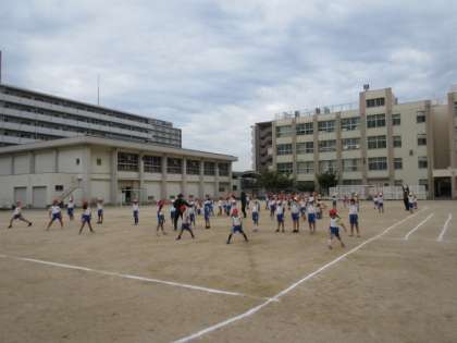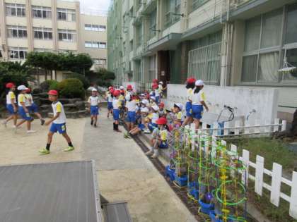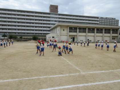 2年生が運動場で運動会で披露する団体演技(ダンス)の練習を行いました。