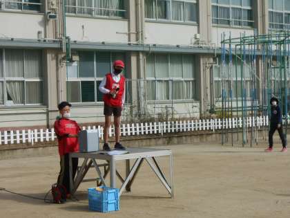 準備運動の後、運動委員会の児童が、各クラスの先頭で走り、ペース走を行います。