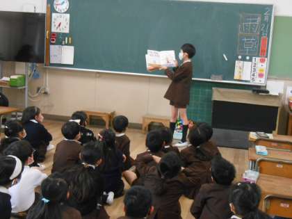 読書に対する興味関心を高めるための取り組みとして、5.6年生の図書委員会の児童が、1年生から4年生の教室に出向き、「絵本の読み聞かせ」を行いました。